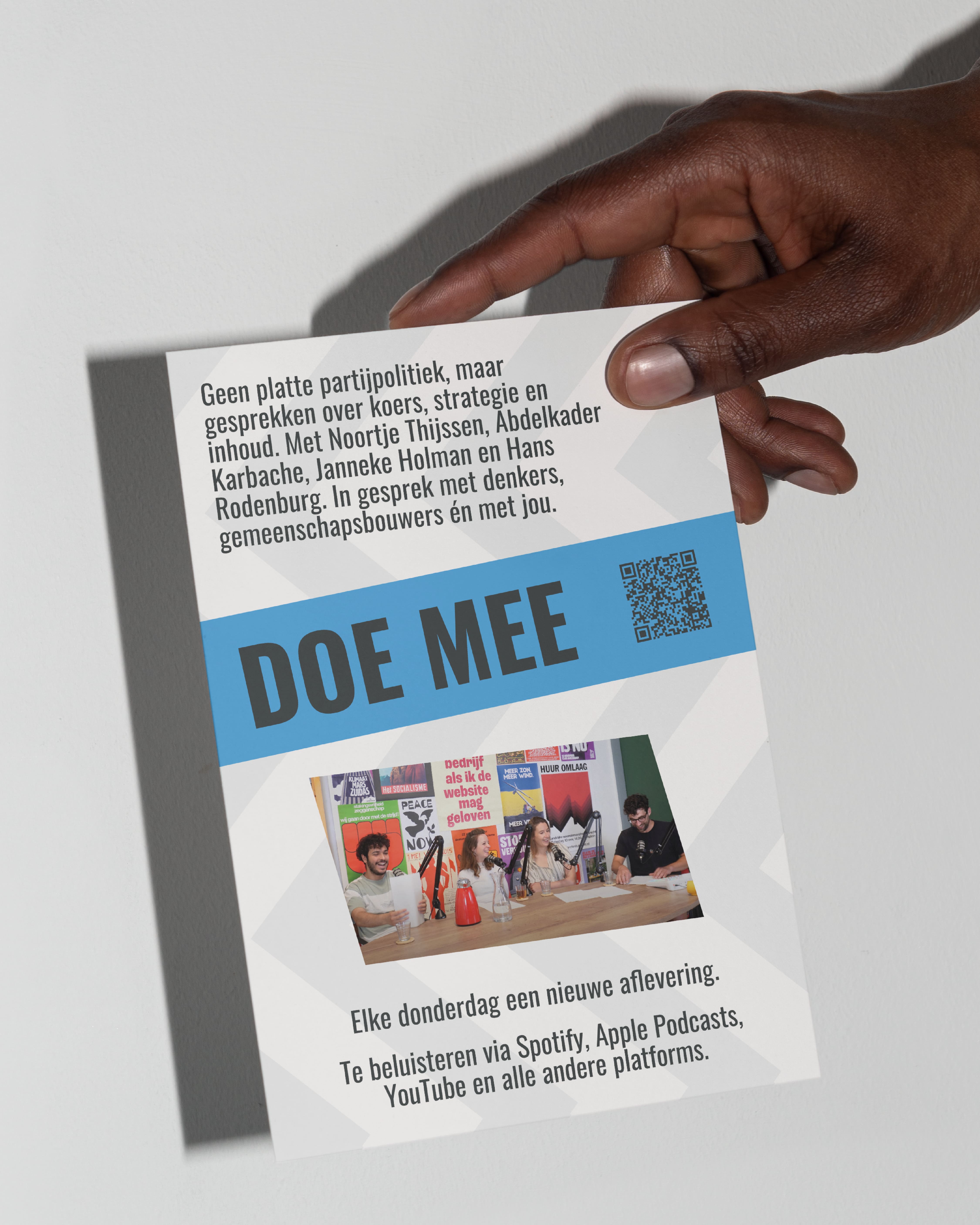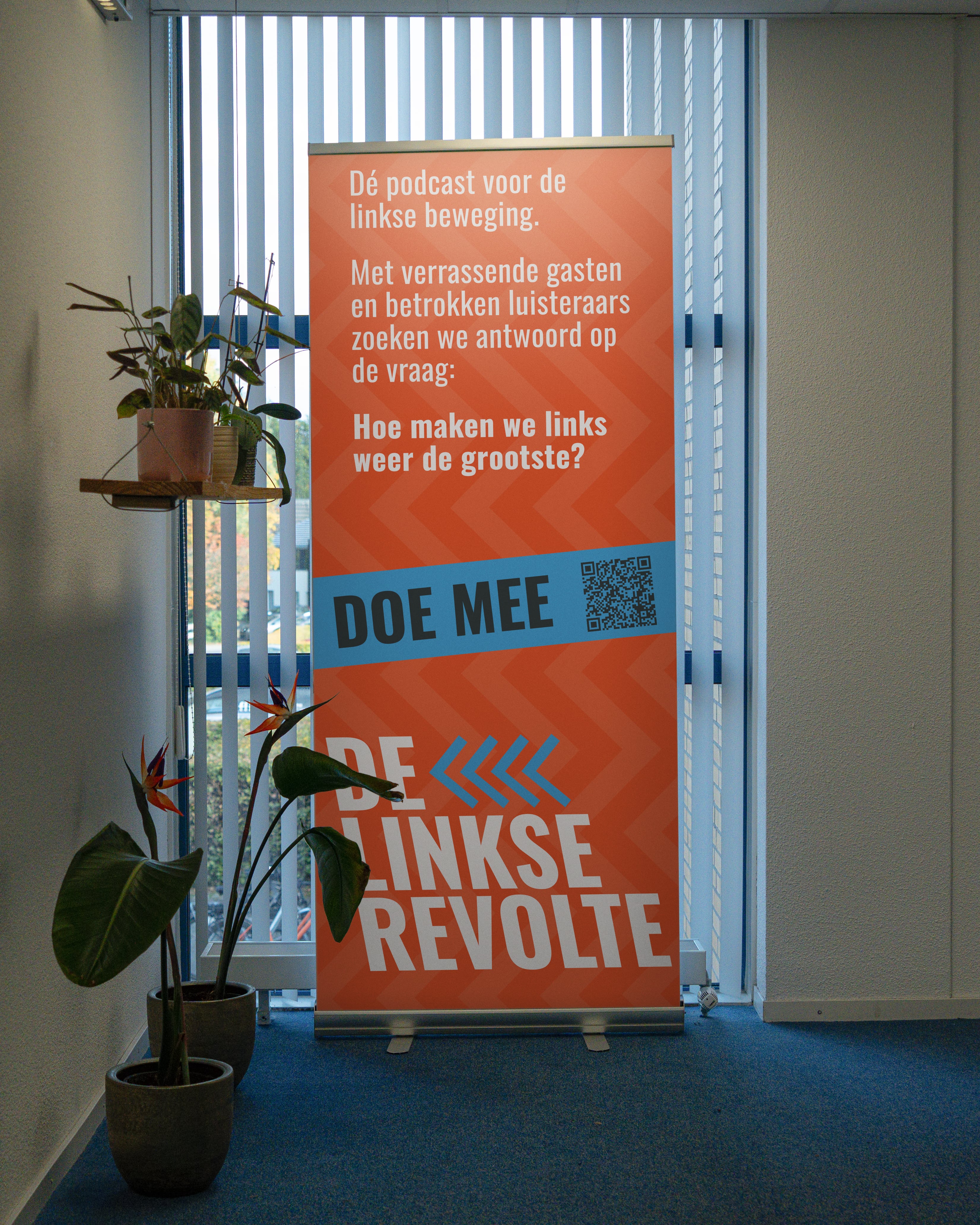 De uitdaging lag in het ontwerpen van een identiteit die strijdbaarheid uitstraalt en opvalt binnen een overwegend rechts en commercieel medialandschap. Het beeldmerk helt zichtbaar naar links en verwijst naar de voorhoede die de podcast wil zijn in het verlinksen van het publieke debat. De vormentaal is eenvoudig en direct, met sterke kleurcontrasten die passen bij de geschiedenis van de linkse beweging. Zo ontstaat een identiteit die herkenbaar is, makkelijk toepasbaar en duidelijk maakt waar De Linkse Revolte voor staat: samen richting verandering.